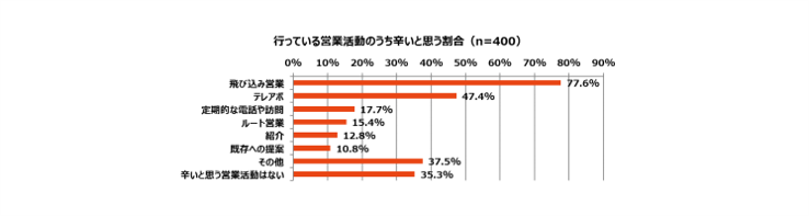 次に「行っている営業活動のうち、つらいと思う割合」に関する設問では、「飛び込み営業」が77.6%と最も多く、次いで「テレアポ(電話営業)」と回答した割合は47.4%と高く、 既存営業に比べて新規顧客獲得のための営業活動の方が辛いと思っている人の割合が高い傾向が分かりました。