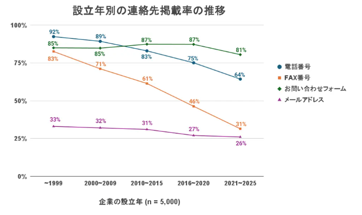 株式会社FUTUREWOODSが実施した調査によると、設立年別に分類した国内企業5,000社のうち、新興企業の3社に1社以上が電話番号を非公開にしている実態が明らかになりました[注2]。