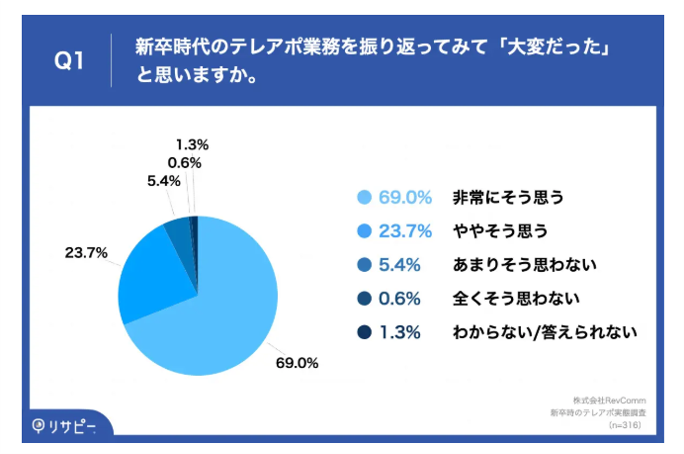 しかし、株式会社RevCommの調査によると、新卒時代のテレアポ業務について「大変だった」と答えた人は92.7%にのぼり、そのうち「非常にそう思う」が69.0%、「ややそう思う」が23.7%でした[注1]。