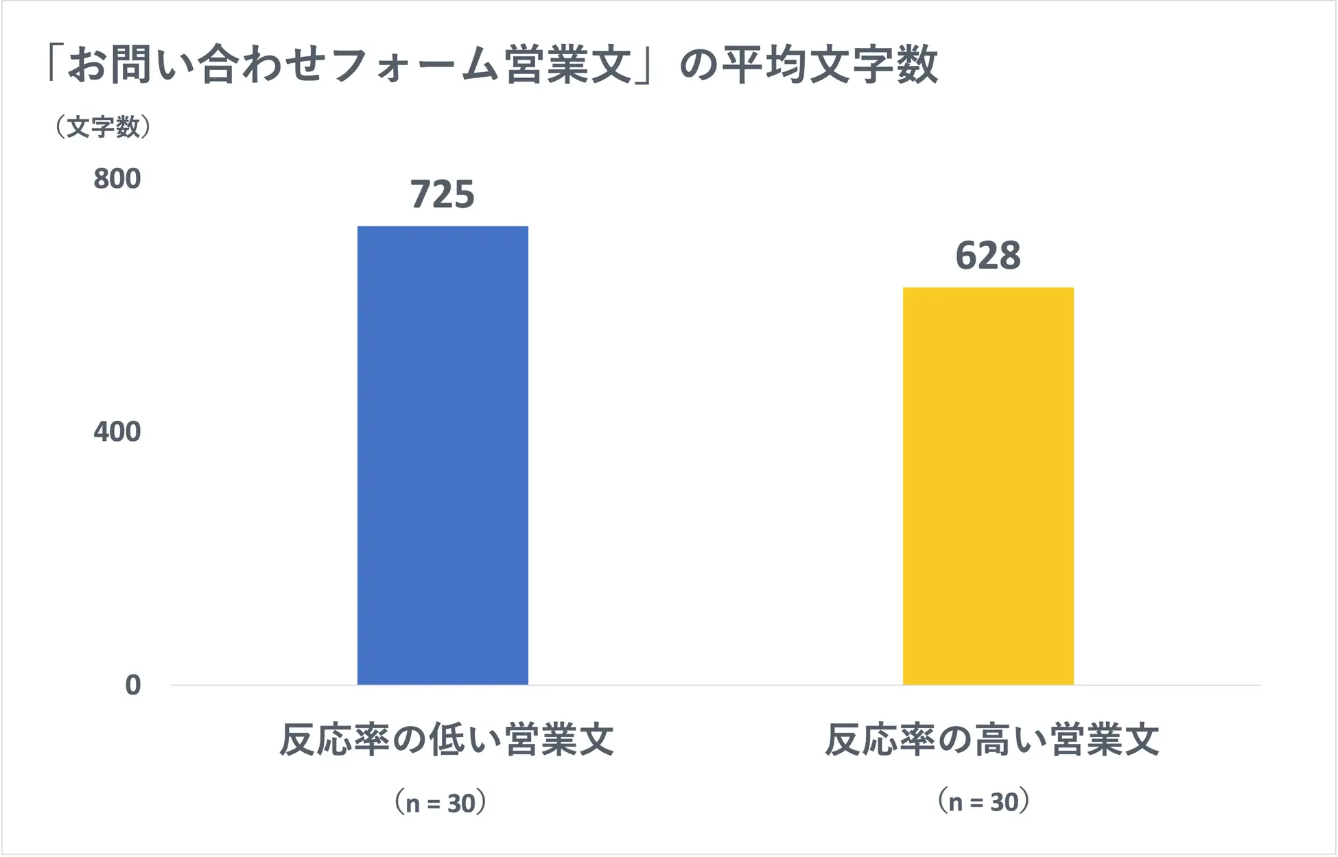 調査では、問い合わせフォーム営業を行う300社のうち、反応率上位30社と下位30社を比較。その結果、反応率の高い営業文の平均文字数は628文字と、反応率の低い営業文(平均725文字)よりも約100文字少ない傾向が見られました。これは、無駄を省いた読みやすい構成が、受け手の理解やアクションを促していることを示しています[注1]。