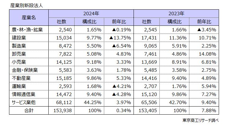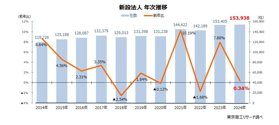 東京商工リサーチ:2024年の「新設法人」数は 15万3,938社 最多件数を更新、1次産業、建設業は減少