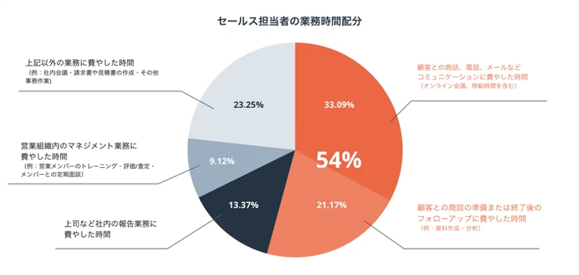 HubSpot Japan株式会社が行った調査によると、営業担当者が顧客とのやりとりに使っている時間は、業務時間の54%。理想としては「1日にあと25分」顧客と接する時間を増やしたいと考えていることがわかりました[注1]。
