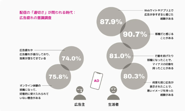 生活者の87.9%が「Webサイトやアプリで広告が多すぎると感じたことがある」と回答し、さらに81.0%は「広告が行動を妨げた結果、広告主に対して悪印象を持った経験がある」と答えています。
